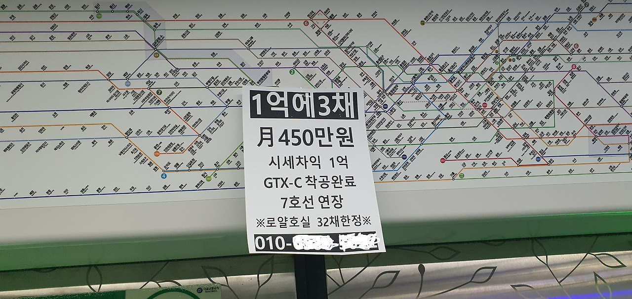 전단지에는 1억에 3채 월 450만 원, 시세 차익은 1억이란다. GTX-C 노선 착공 완료, 7호선도 연장, 내용을 요약하자면 1억 투자하면 수입이 좋고 입주 조건도 괜찮아 투자할 가치가 충분하다는 뉘앙스다. 여기에 로열호실 32채 한정이므로 서두르지 않으면 좋은 기회 놓칠 수도 있다는 재촉도 담겨 있다.