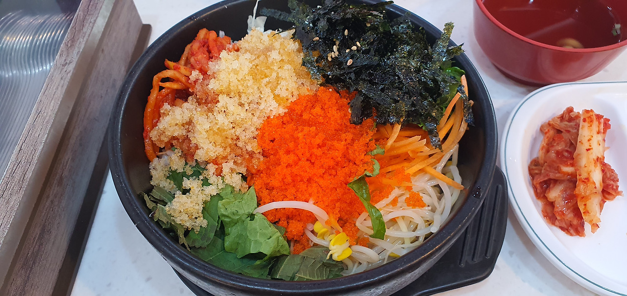 그리고 마지막으로 주홍색과 흰 노랑빛의 화려한 색감의 날치알을 화룡정점 듬뿍 얹어 나온다. 여기에 각자 취향에 맞게 고소한 참기름과 초고추장을 적당히 넣고 이리비비고 저리 비벼 한 입 입에 가득 넣으면 날치알 특유의 '툭~툭~' 터지는 식감이 첫 숟가락부터 "그래 바로 이 맛이야'가 저절로 나올 정도로 무릎을 탁 치게 만든다.