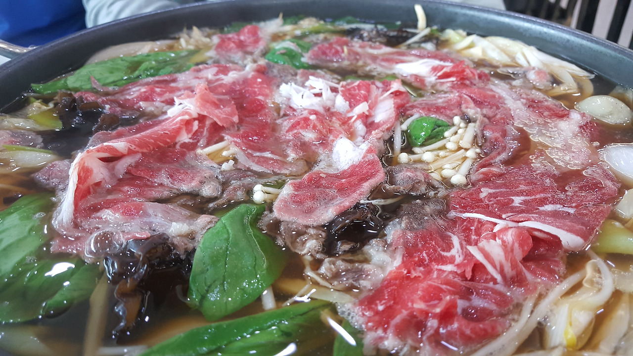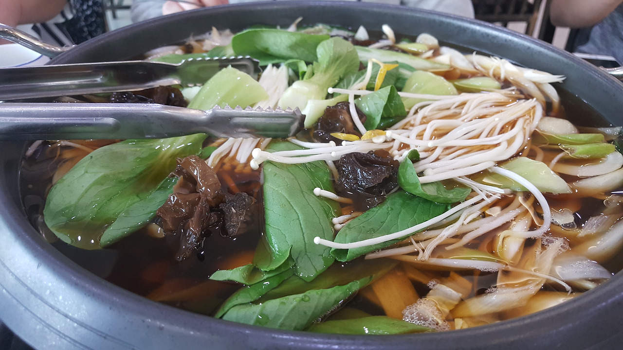 목이버섯과 팽이버섯 등 각종 버섯류에 청경채와 양파가 주류를 이룬 재료들이 퐁당 빠진 육수에 나왔다. 풍성하게 담긴 소고기 접시도 먹음직스러운 자태를 드러내며 등장했다. 이렇게 나오는 것을 보니 우리 판단에는 소불고기보다는 소고기 버섯 샤부샤부에 가까웠다.