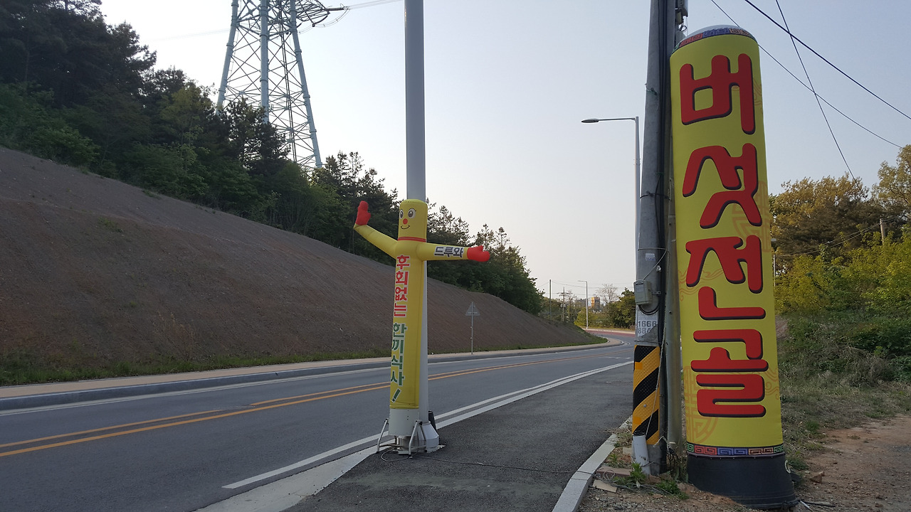 얼마나 달렸을까, 100여 미터 전방 앞에서 무엇인가 요란하게 춤을 추워 대는 모습이 눈에 들어왔다. 가까이 다가가니 보니 그에 정체는 막대풍선 모양의 에어 간판이었다. 그에 가슴에는 '후회 없는 한 끼 식사!라는 자신감 넘치는 명찰을 당당하게 달았다. 다른 한 손에는 두루와, 두루와를 연발하고 있었다.