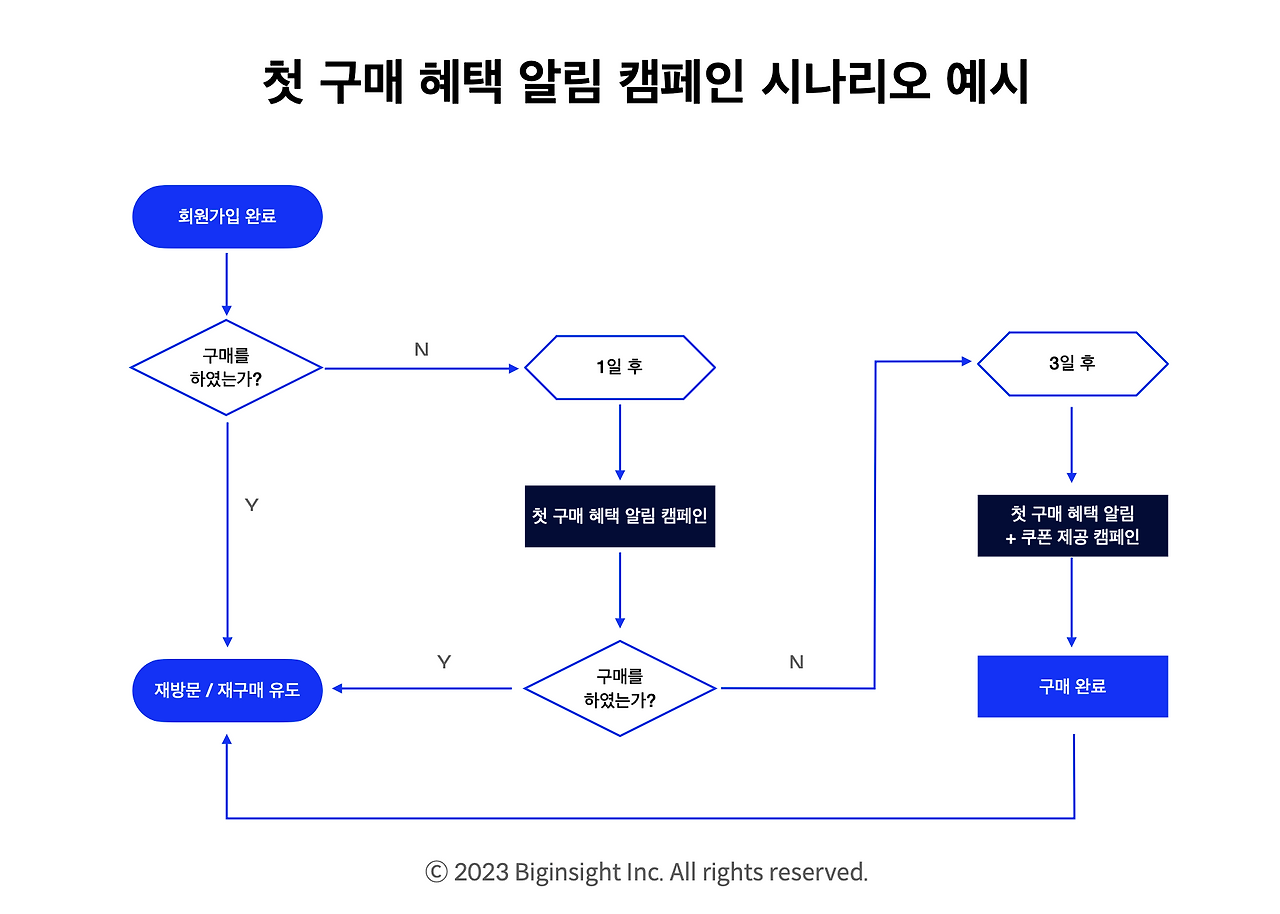 타겟: 회원 가입을 완료한 고객 중 1차 캠페인 이후에도 구매하지 않은 고객에게 자동 발송 되도록 설정