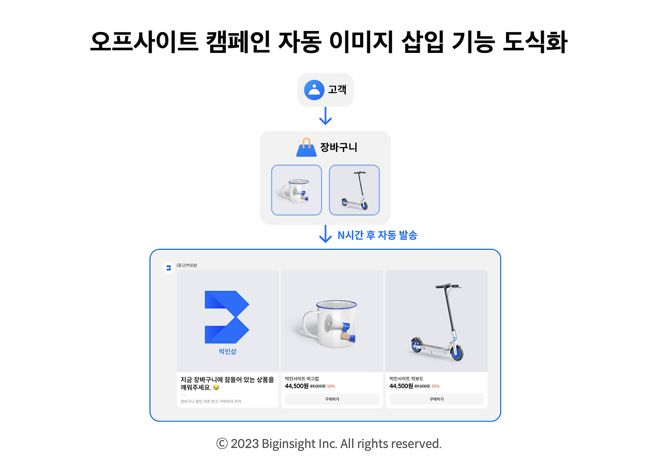 자동 이미지 삽입 기능은 고객이 장바구니에 상품을 담거나 구매했을 때 해당 상품의 이미지와 정보를 자동으로 불러와서 오프사이트 캠페인에 반영하는 기능입니다.