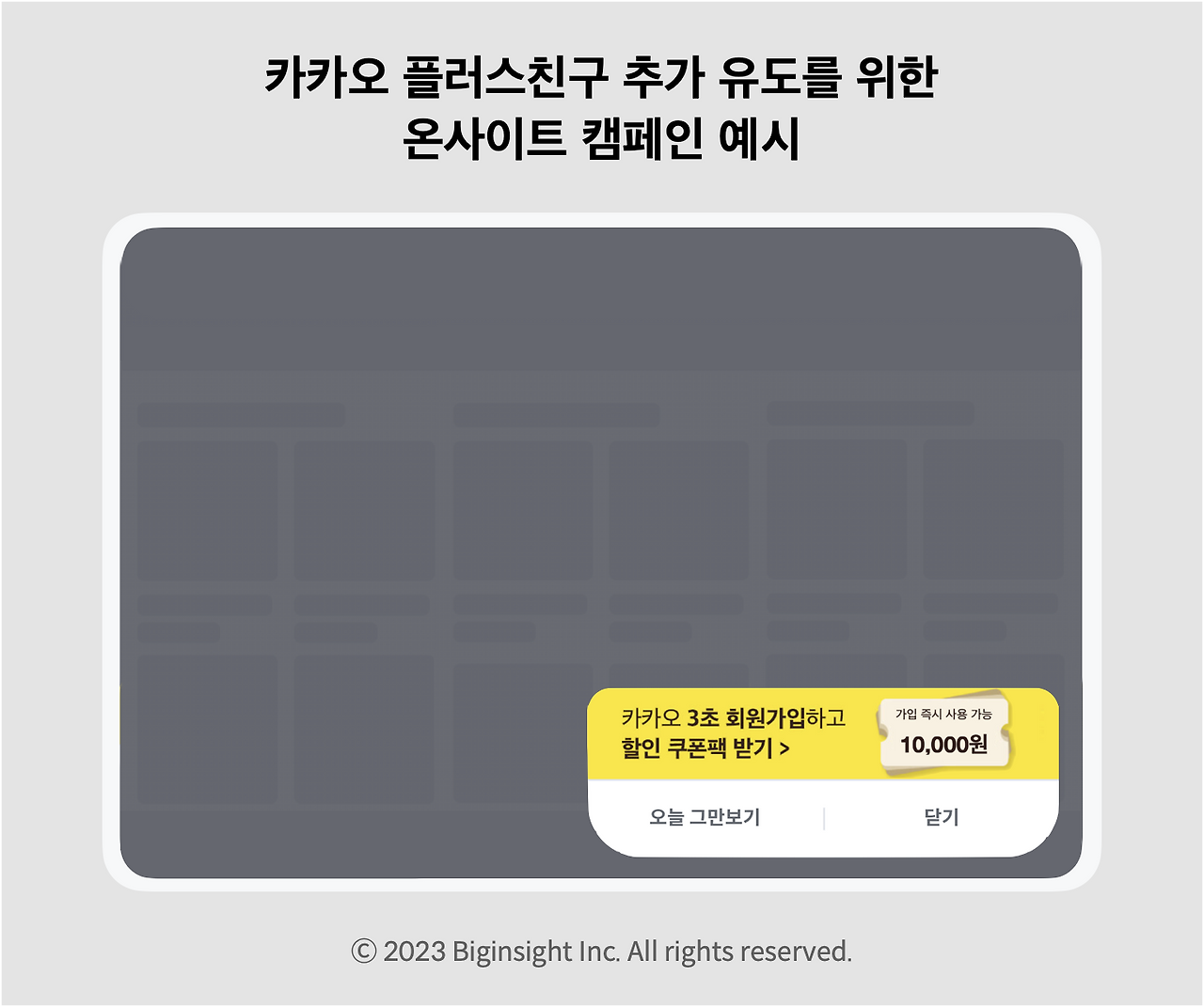 플러스친구 모수가 충분하게 쌓이지 않은 초기 단계의 브랜드라면 웹사이트에 유입한 고객을 대상으로 온사이트 마케팅을 함께 진행해 보세요. 카카오 플러스친구 추가 유도 메시지를 혜택과 함께 노출하면 오프사이트 캠페인의 타겟인 플러스친구 모수를 확보하는 데에 도움이 됩니다.