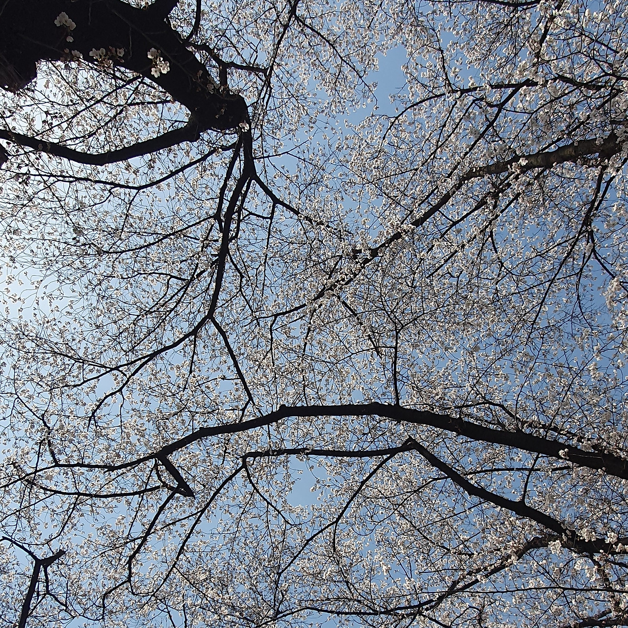 왕벚나무 꽃이 핀 우리 동네 공원. 꽃으로 하늘을 가려야 만개된 상태다. 그래도 인파가 몰린다.