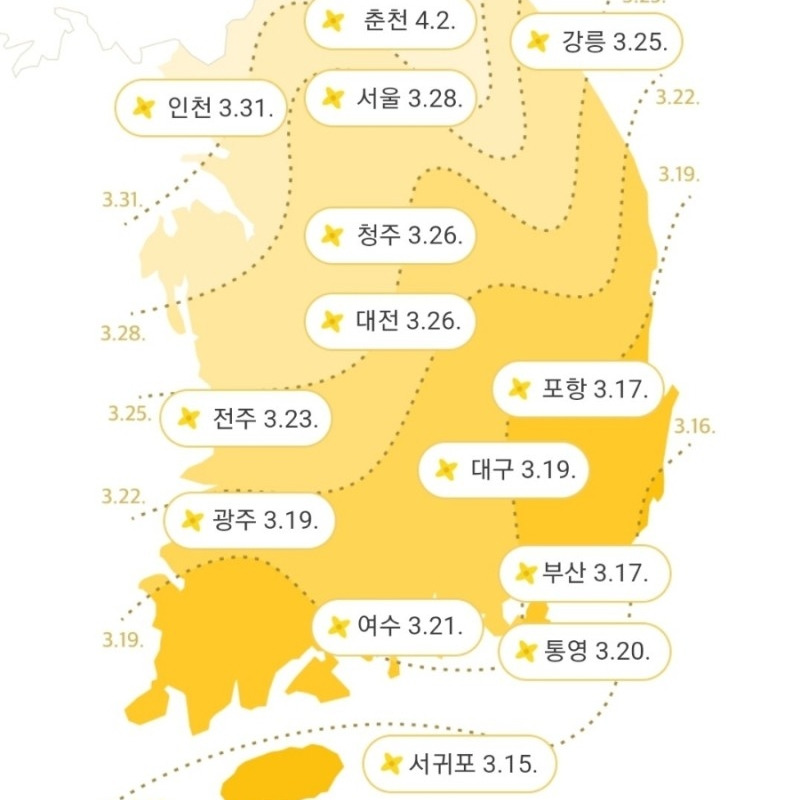 산림청이 올 3월 초에 발표한 개나리 개화시기 예측 지도. 지난 주 길어진 꽃샘추위로 개화가 늦어진 꽃들이 많다.