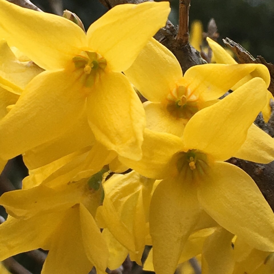 꽃이 4 갈래로 갈라진 개나리. 사진 속 꽃들은 꽃가루 주머니가 달린 2개의 수술이 암술보다 긴 수꽃들이다.