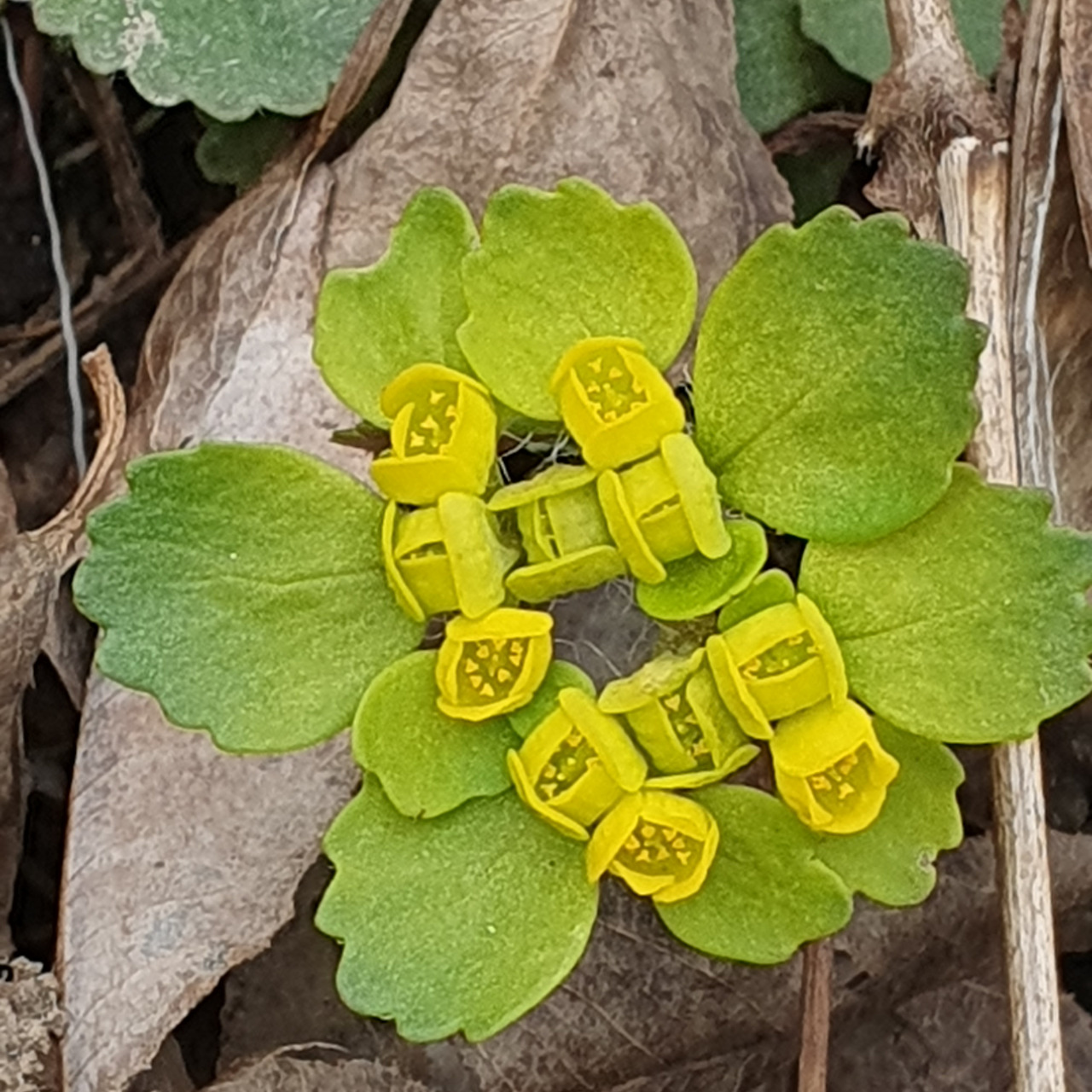 4~5월에 노란색 작은 꽃이 촘촘히 모여 핀다. 꽃 둘레의 잎은 처음에는 녹색이다가 노란 꽃이 피면 함께 황금색으로 변한다.꽃의 수정이 끝나면 다시 녹색으로 돌아간다. 꽃받침잎은 곧추서고 둥글며 수술은 8개, 암술은 2개.가운데 꽃밥은 노란색.