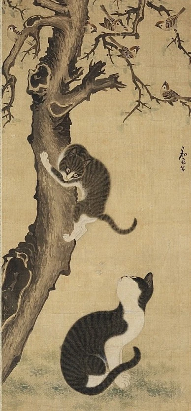 고양이 두 마리와 나뭇가지 위에 앉은 참새들을 그린 화재 변상벽의 묘작도. 노인에게 장수를 기원하는 뜻이 담겨 있다.