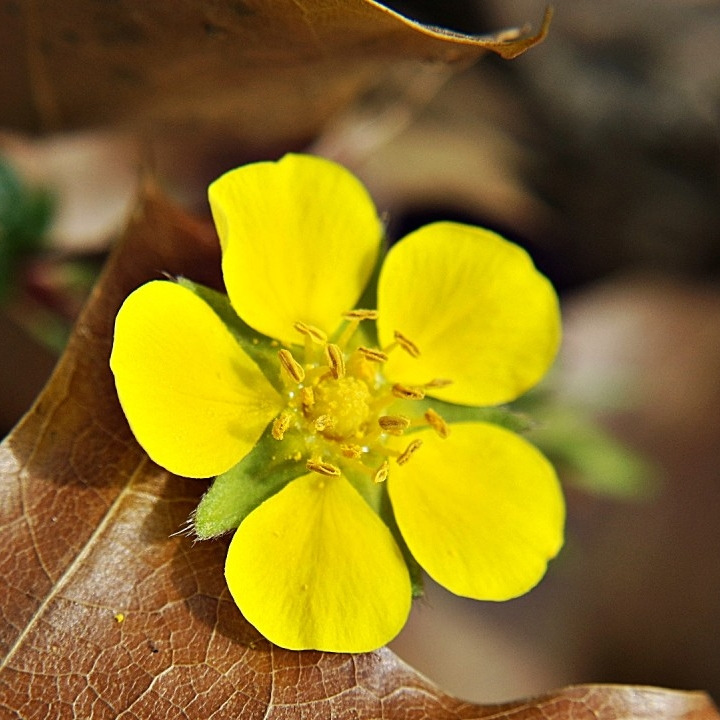 양지꽃과 비슷한 뱀딸기 꽃. 노란 꽃잎 사이사이 녹색의 꽃받침 길이가 꽃잎과 비슷하거나 더 길다. 사진= 들꽃사랑연구회