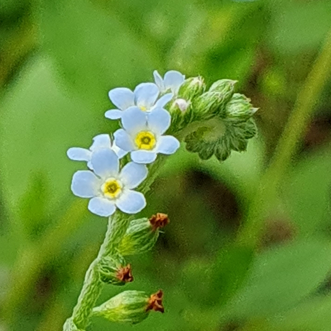 오늘은 꽃마리를 소개합니다. 작디작은 꽃이에요. 꽃봉오리는 연분홍색이고 막 피어난 꽃은 연한 하늘색. 꽃 중앙에 정 5각형의 작은 구멍이 있고 노란색 띠로 둘러싸여 있습니다.