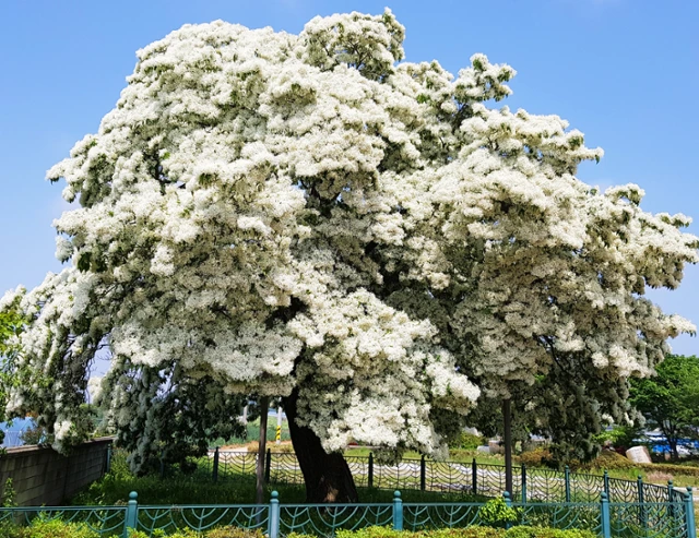 전북 고창군 중산리 소재 이팝나무(천연기념물 183호). 나무를 뒤덮은 흰색 꽃이 이밥(쌀밥)처럼 보인다. 사진= 한국일보, '서효원의 식물 이야기'