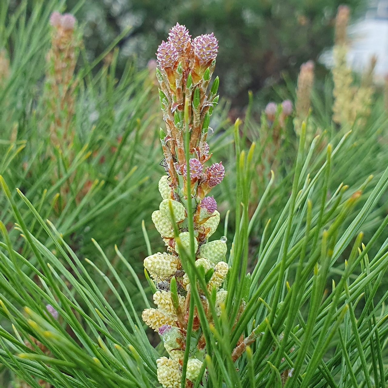 이게 소나무 수꽃의 꽃가루입니다. 손으로 톡 건드리면 꽃가루가 엄청나게 쏟아져요. 이 가루를 모아 다식을 만들어 먹기도 했지요.