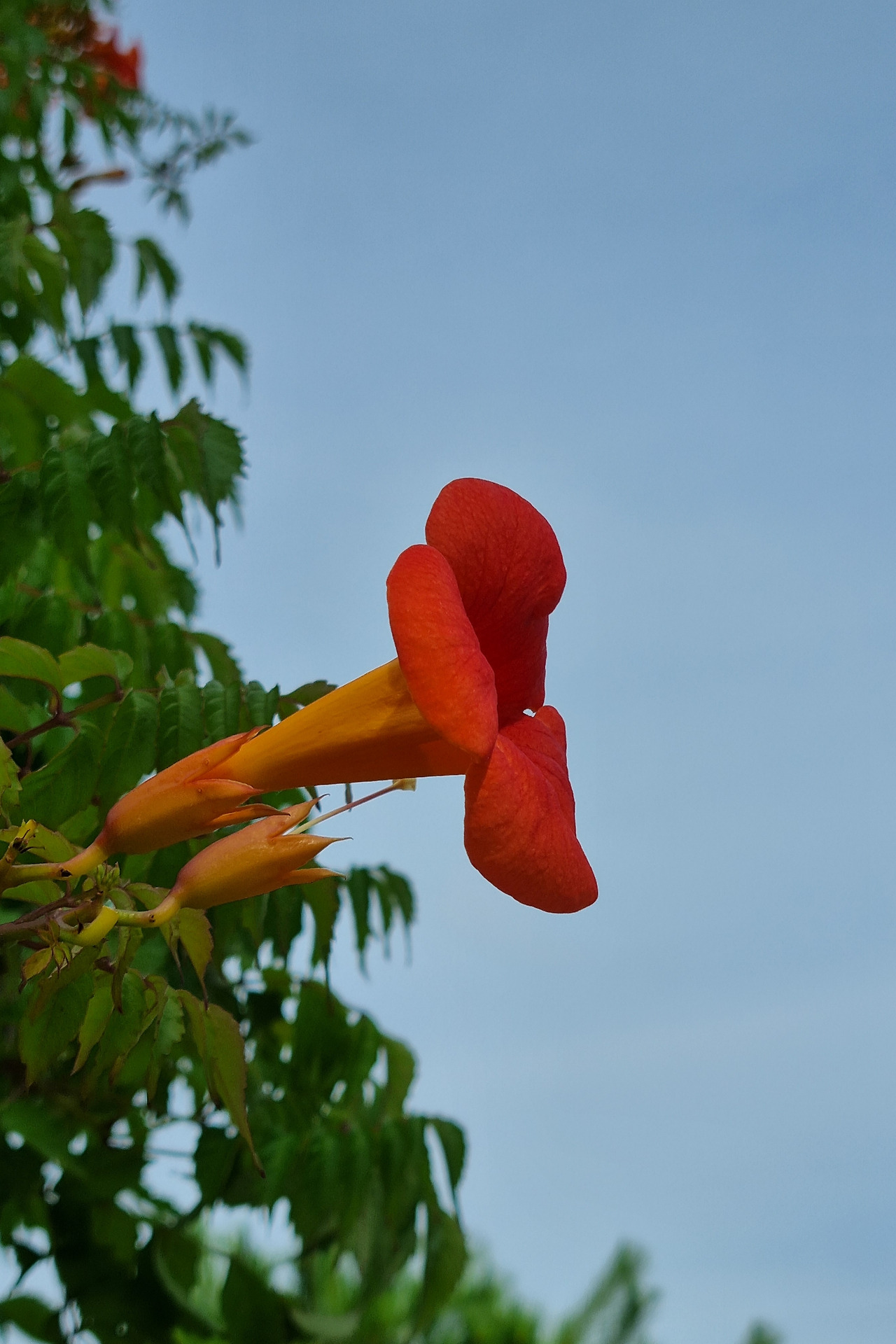 꽃이 유난히 붉고 아랫부분이 뾰족한 미국능소화는 열매를 잘 맺는다.