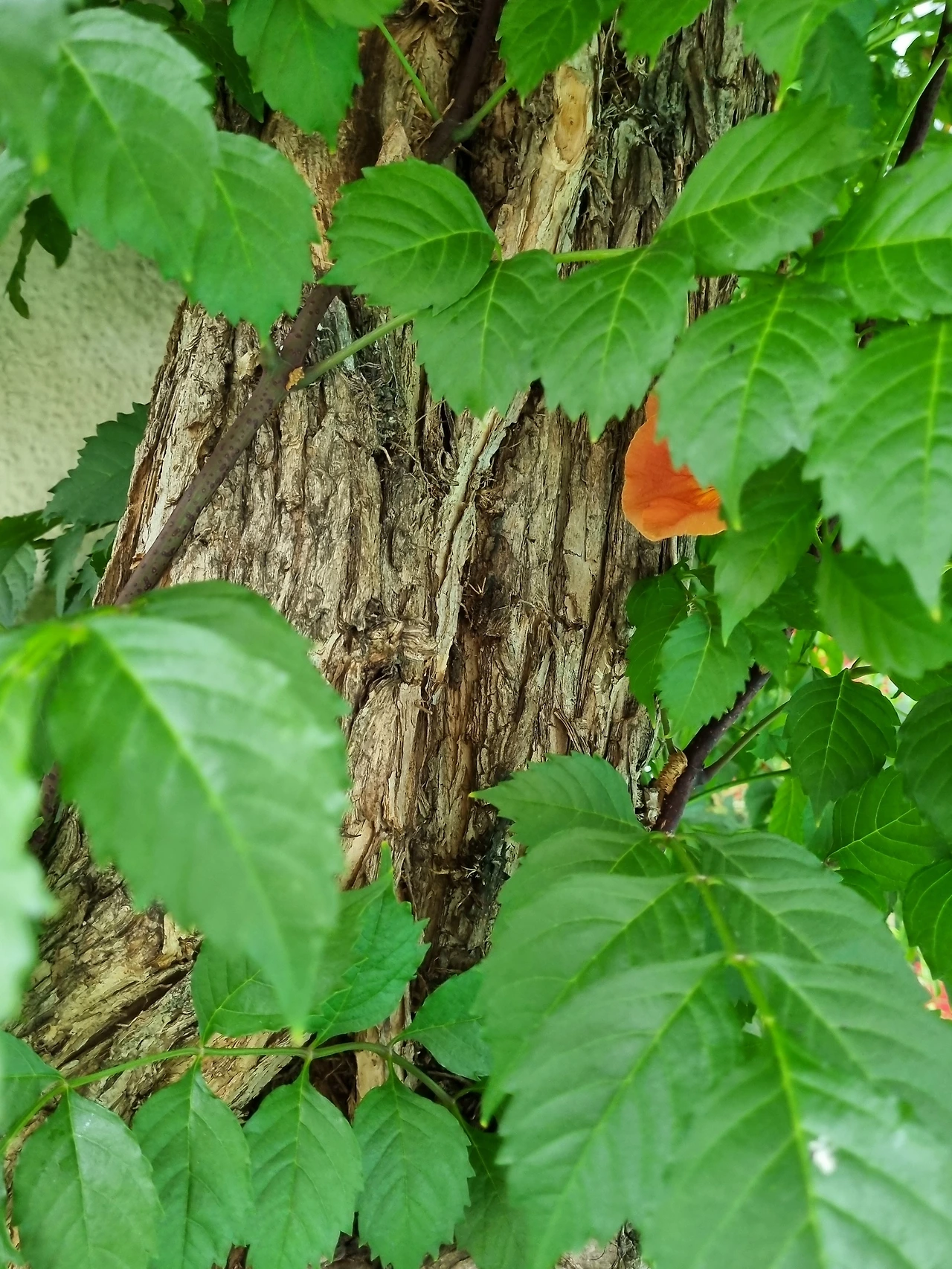 능소화가 감고 올라간 나무는 햇빛을 못 받아 결국은 죽는답니다. 그만큼 능소화 잎이 크고 무성해요.