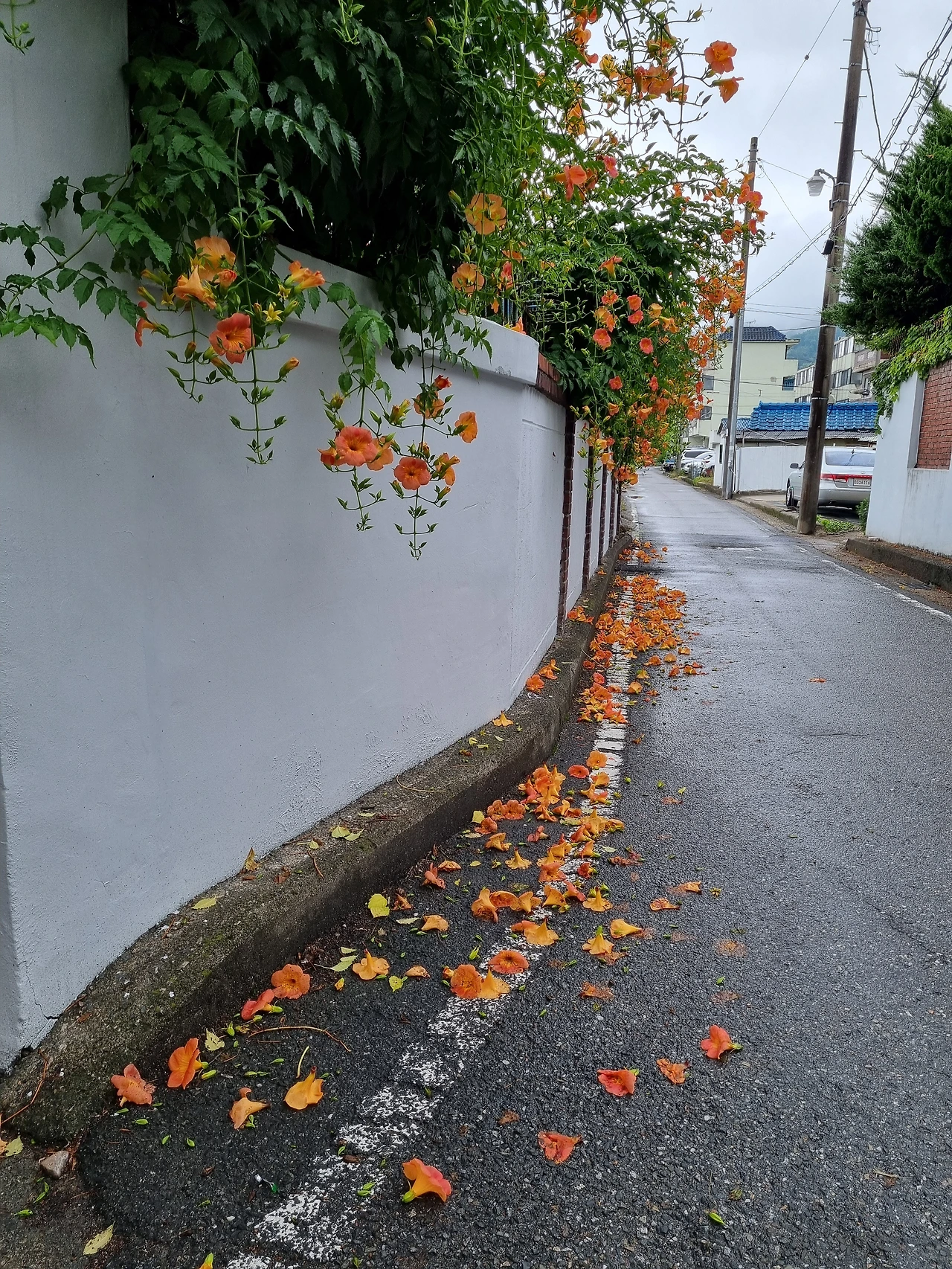 동백꽃처럼, 신선한 상태의 꽃이 통째로 깔끔하게 떨어져 바닥을 다시 꽃밭으로 만들어요.