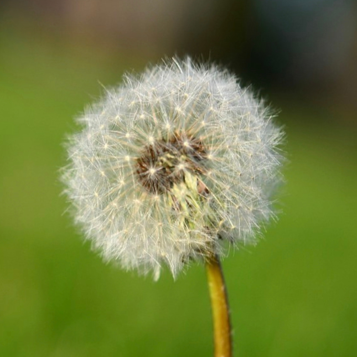 민들레 씨앗들이 공 모양을 이루고 있다.각각의 씨앗들은 털 모양의 관모 아래 매달려 공중 비행을 한 뒤 지상으로 떨어져 번식을 한다.