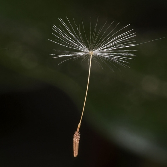 민들레 씨앗. 아래쪽이 씨앗이다. 위의 털은 갓털 또는 관모라고 한다. 바람에 날리기 쉽고, 공중에 오래 머물 수 있다. 적당한 땅에 떨어지면 뿌리부터 내린다.