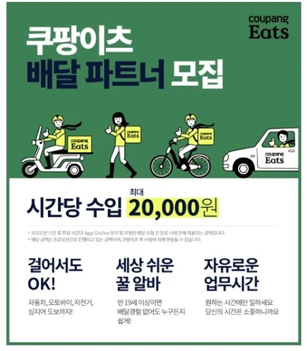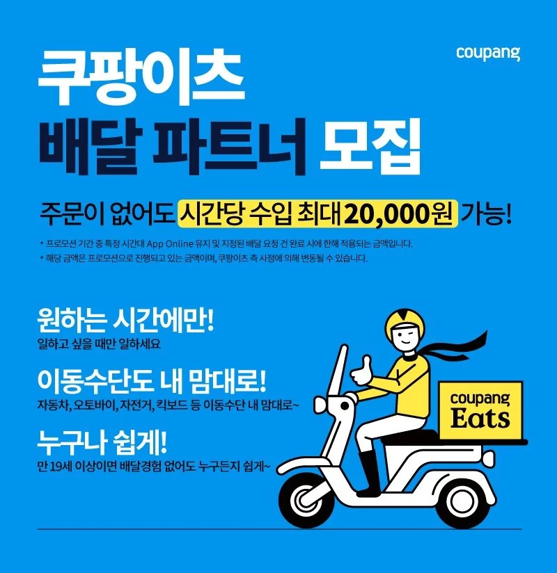 쿠팡 입장에서 가장 획득하기 쉬운 그룹이지 않을까 싶다. 별도의 보험 등록이나 귀찮은 서류 과정이 필요 없다. 그냥 등록 후 안전교육 동영상을 시청하면 언제든 내가 원하는 시간에 쿠팡 이츠에서 보내주는 Call을 받고, 배달을 수행하면 된다. 다른 교통수단을 이용하는 파트너보다 활동반경이 좁고, 시간이 오래 걸린다는 단점을 커버할 수 있다면 쿠팡이츠가 가장 잘 활용하고 싶은 그룹이지 않을까 싶다. 실제로 테헤란로에는 최근 퇴근 후 쿠팡이츠 백팩을 메고 다니는 사람들이 눈에 띄게 늘어나고 있다. 주위에 쿠팡이츠를 하는 지인들에게 물어보면, 퇴근하고 운동 겸 2~3건 수행하고 그 돈으로 치킨 사 먹을 때의 쾌감이 엄청나다고 한다.