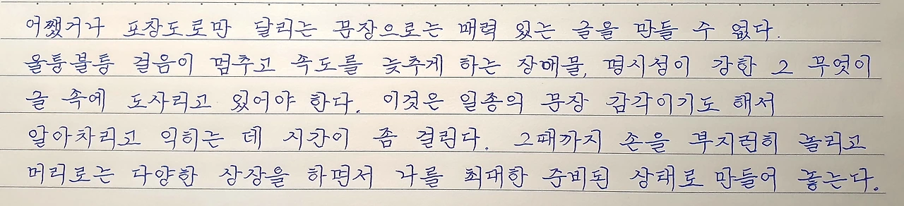 작가는 오늘 글에서, 매력적인 글을 쓰기 위해서 문장 감각을 키워라고 했다. 시간이 걸리니 조급하지 말고 손으로 부지런히 쓰라고 당부했다.