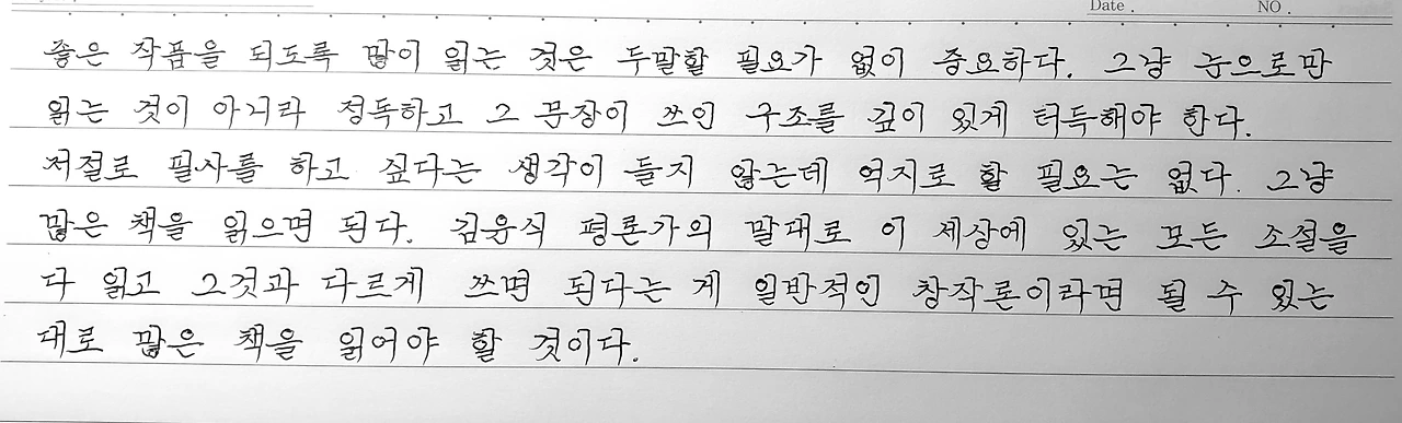 좋은 작품을 되도록 많이 읽는 것은 두말할 필요가 없이 중요하다. 그냥 눈으로만 읽는 것이 아니라 정독하고 그 문장이 쓰인 구조를 깊이 있게 터득해야 한다. 저절로 필사를 하고 싶다는 생각이 들지 않는데 억지로 할 필요는 없다. 그냥 많은 책을 읽으면 된다. 김윤식 평론가의 말대로 이 세상에 있는 모든 소설을 다 읽고 그것과 다르게 쓰면 된다는 게 일반적인 창작론이라면 될 수 있는 대로 많은 책을 읽어야 할 것이다.