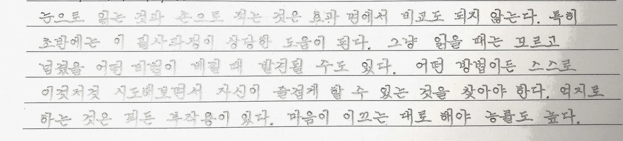 눈으로 읽는 것과 손으로 적는 것은 효과 면에서 비교도 되지 않는다. 특히 초반에는 이 필사과정이 상당한 도움이 된다. 그냥 읽을 때는 모르고 넘겼을 어떤 비법이 베낄 때 발견될 수도 있다. 어떤 방법이든 스스로 이것저것 시도해보면서 자신이 즐겁게 할 수 있는 것을 찾아야 한다. 억지로 하는 것은 뭐든 부작용이 있다. 마음이 이끄는 대로 해야 능률도 높다.