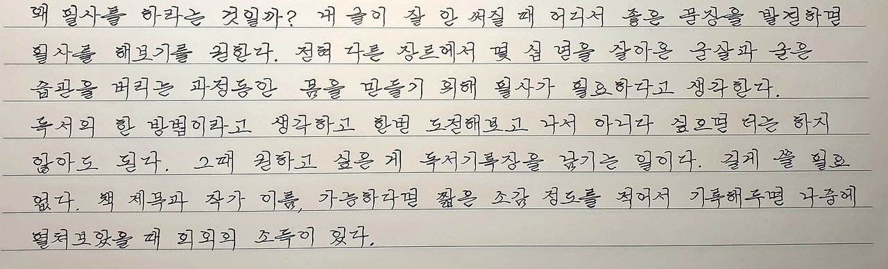 왜 필사를 하라는 것일까? 내 글이 잘 안 써질 때 어디서 좋은 문장을 발견하면 필사를 해보기를 권한다. 전혀 다른 장르에서 몇 십 년을 살아온 군살과 굳은 습관을 버리는 과정 동안 몸을 만들기 위해 필사가 필요하다고 생각한다. 독서의 한 방법이라고 생각하고 한번 도전해보고 나서 아니다 싶으면 더는 하지 않아도 된다. 그때 권하고 싶은 게 독서기록장을 남기는 일이다. 길게 쓸 필요 없다. 책 제목과 작가 이름, 가능하다면 짧은 소감 정도를 적어서 기록해두면 나중에 펼쳐보았을 때 의외의 소득이 있다.