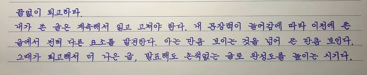 똑같이 잘 따라 썼는가를 살피는 게 아니다. 누가 누가 잘 베꼈나를 겨루는 게 아니다. 개성 있는 글씨가 최종 목표다. 그러기 위해서는 고수의 비법을 벤치마킹해야 한다. 어떻게 획을 시작하고 마무리하는가? 자음을 위치에 따라 어떻게 변화를 주는가? 자모음의 간격을 얼마나 유지하는가? 어디서 시작하여 크기를 일정하게 유지하는가? 획과 획을 어떻게 잇고 연결하는가? 살 필 곳이 한두 군데가 아니다. 물어서라도 비기를 알아내자.