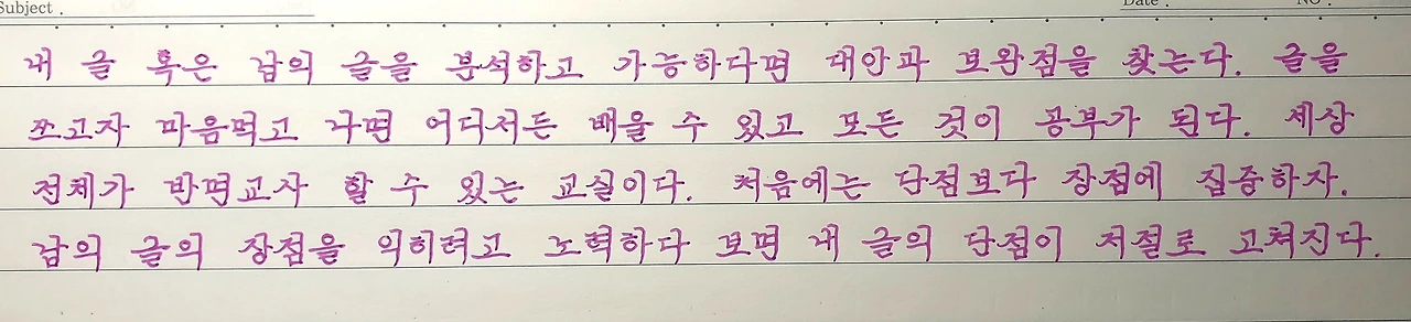 가장 큰 차이점을 발견하면 계획이 선다. 큰 것부터 고쳐나가는 게 효과적이다. 오늘 필사 글대로 타인 글씨의 장점을 파악하고 익히다 보면 자신 글씨의 단점이 저절로 고쳐진다. 본보기가 되는 글씨를 자주 접하는 것만으로도 글씨는 좋아질 수 있다.