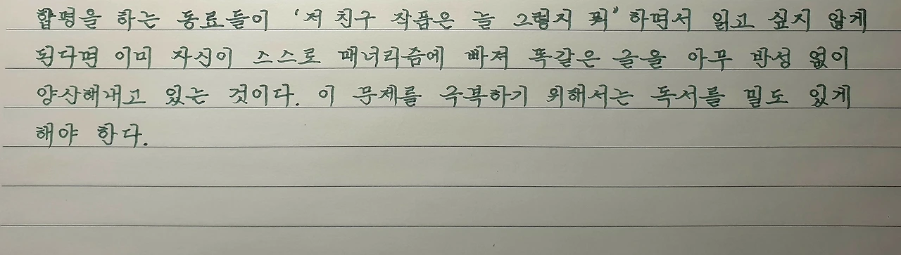성질 급한 사람은 계속 참여하기 어렵다. 책 내용에 치중한 필사를 한 사람이라면 '이건 아니지~'라는 비아냥을 할 수 있다. 훈수를 좋아하는 이는 입이 근질근질할 수도 있다. 허점 투성이인 필사다.