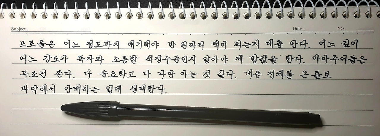 본문을 쓸 때도 리듬을 정해보자. 하루에 쓸 필사 양을 시간보다는 글밥으로 계획한다. 시간보다는 문단이나 문장 개수를 목표로 정했을 때, 집중력이 살아나고 템포 유지에 용이하다. 시간에 쫓기면 늘 실수하기 마련이다.