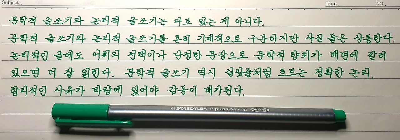 오늘 글에서 작가는 문학적 글쓰기와 논리적 글쓰기는 상통한다고 했다. 글씨도 이와 같다. 생활 글씨와 취미 글씨도 사촌지간이다. 생활 글씨도 획이 일정하고 강약의 변화를 주면 더 보기 좋은 글씨가 된다. 취미 글씨 역시 특정 지점을 더욱 강조한다면 개성 강한 글씨를 쓸 수 있다.