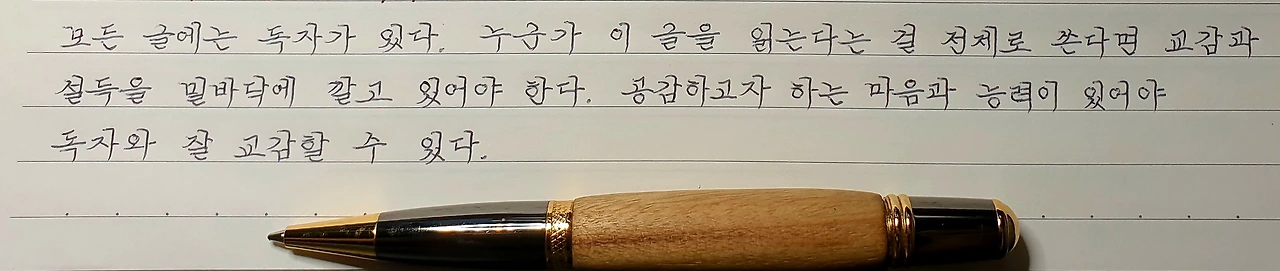 나의 글씨도 이런 목적을 충분히 포함한다. 필사 글씨는 정성이 두 배 이상 들어간다. 책 내용을 정확하게 따라 쓰기 위함이 첫 번째 목적이기 때문이다. 두 번째 목표는 글씨 그 자체에 둔다. 보기 좋고 읽기 편한 글씨를 써서 보는 이들이 글씨를 쓰고 싶도록 만들고 싶다. 이는 나의 유튜브 채널과 콘텐츠 그리고 매일 필사 방송의 궁극의 목표이기도 하다.