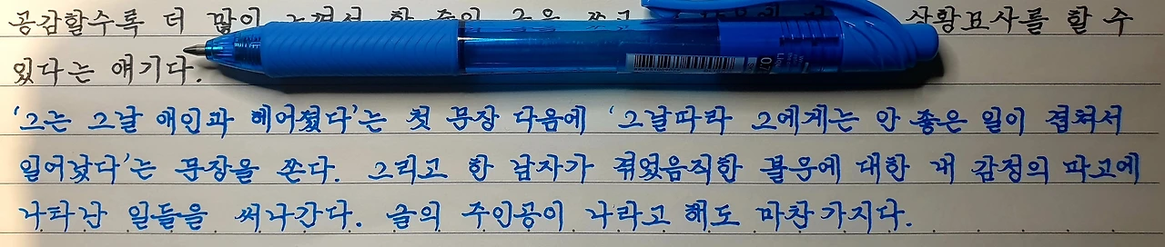 가로쓰기도 기준선이 있다. 줄 칸 노트의 밑줄에 글자를 정렬한다. 글씨 크기는 같게, 높이는 일정하게 쓰는 게 핵심이다. 글자 사이의 간격이나 단어 띄어쓰기도 상당히 거슬린다. 크기, 높이 맞추기도 쉽지 않은데 자간과 단어 간의 일정한 간격을 유지하기란 더 어렵다. 멀리서 보면 간격이 일정한 글씨가 보기 좋다. 하루아침에 잘되지 않는다. 연습 말고는 뾰족한 수가 없다. 자를 대면서 쓸 수도 없는 노릇이고, 자를 대고 쓴다고 해도 좋은 결과를 보장하지 않는다.
