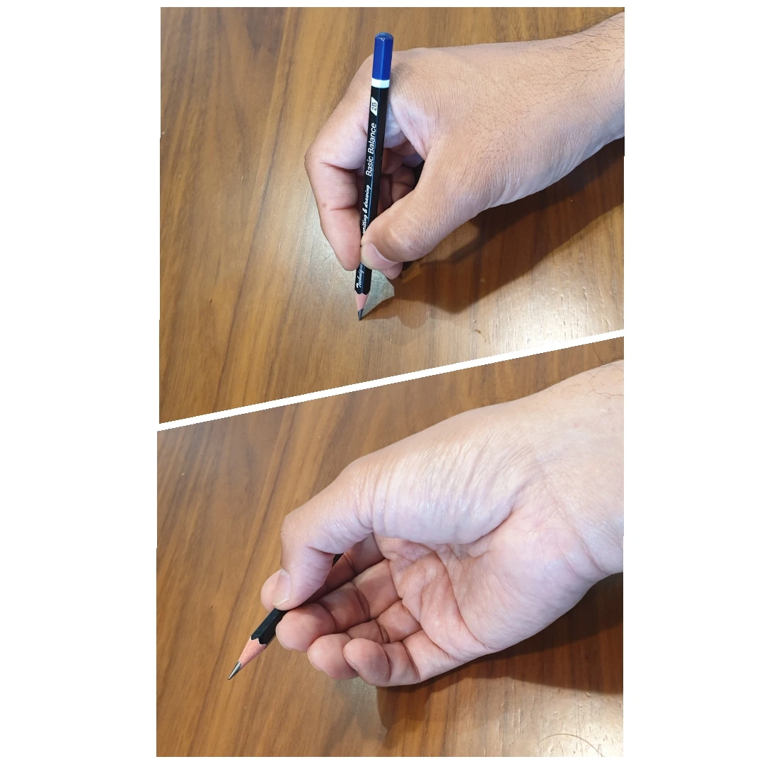 손목만 견고히 유지한 채 손바닥을 아래로 보게 하여 손을 축 늘어뜨린다. 오른손 엄지와 검지+중지를 서로 마주 보게 하고, 이 세 손가락 만으로 펜의 몸통 부분을 잡아 연필심이 바닥을 향하게끔 들어 올린다.