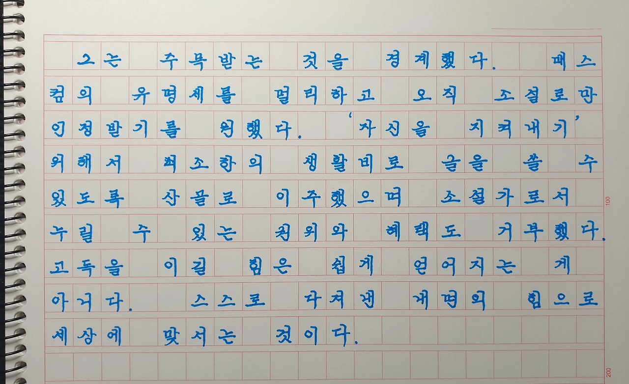 그는 주목받는 것을 경계했다. 매스컴의 유명세를 멀리하고 오직 소설로만 인정받기를 원했다. ‘자신을 지켜내기’ 위해서 최소한의 생활비로 글을 쓸 수 있도록 산골로 이주했으며 소설가로서 누릴 수 있는 권위와 혜택도 거부했다. 고독을 이길 힘은 쉽게 얻어지는 게 아니다. 스스로가 다져낸 내면의 힘으로