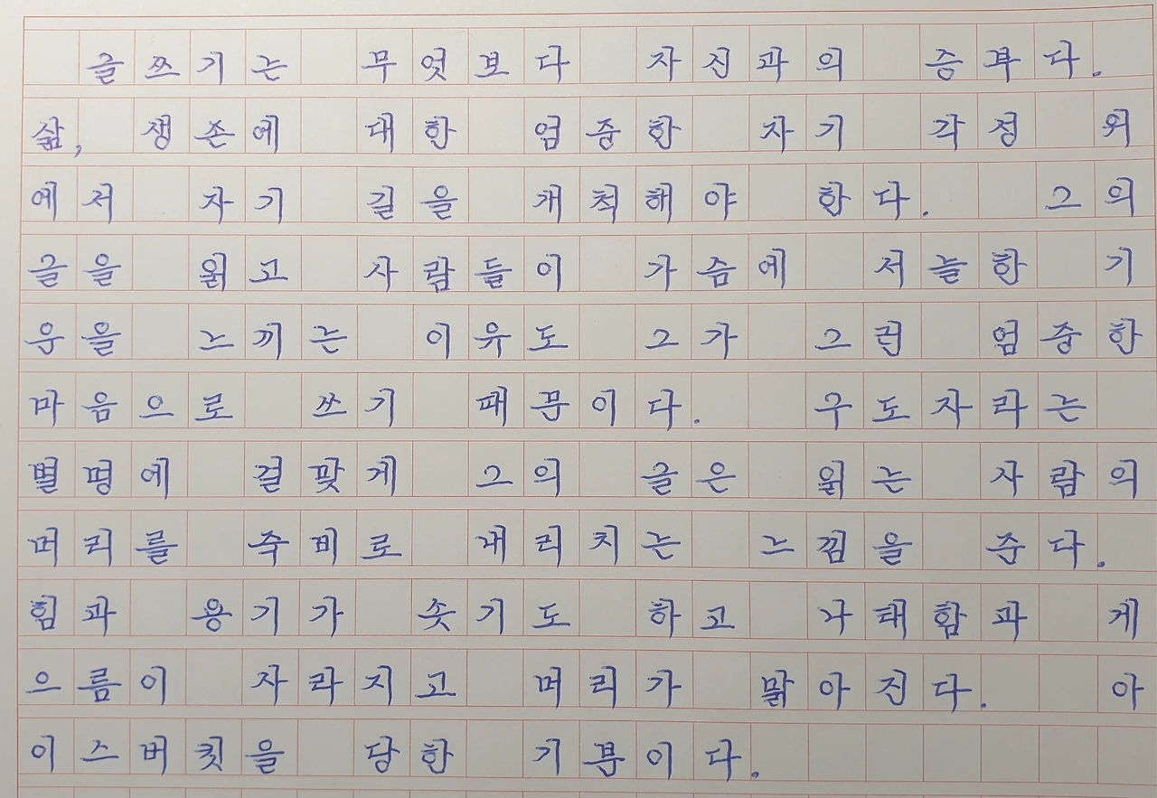 월요일~일요일 매일 밤 10시경에 좋은 책을 선정하여 필사를 하고 있습니다. 재미 없고 지루한 과정일 수 있지만 많은 분들이 저와 함께 필사를 즐기며 하루 15분을 오롯이 자신을 위해 보내고 있