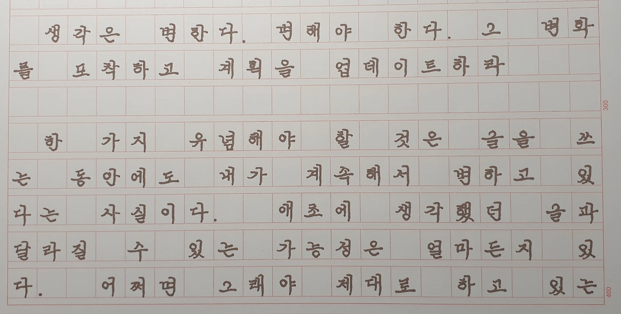 월요일~일요일 매일 밤 10시경에 좋은 책을 선정하여 필사를 하고 있습니다. 재미 없고 지루한 과정일 수 있지만 많은 분들이 저와 함께 필사를 즐기며 하루 15분을 오롯이 자신을 위해 보내고 있