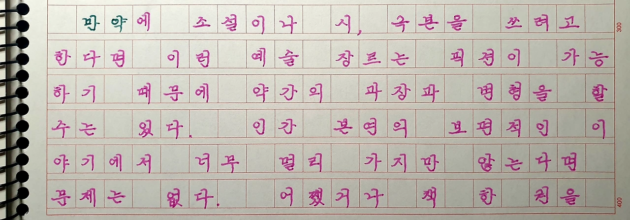 만약에 소설이나 시, 극본을 쓰려고 한다면 이런 예술 장르는 픽션이 가능하기 때문에 약간의 과장과 변형을 할 수는 있다. 인간 본연의 보편적인 이야기에서 너무 멀리 가지만 않는다면 문제는 없다. 어쨌거나 책 한 권을 시작해서 완성하려면 수없이 많은 계단을 올라갸야 한다. 계단 하나하나 오르는 일을 즐겁고 신명나게 해야만 마침내 꼭대기에 도달할 수 있다.