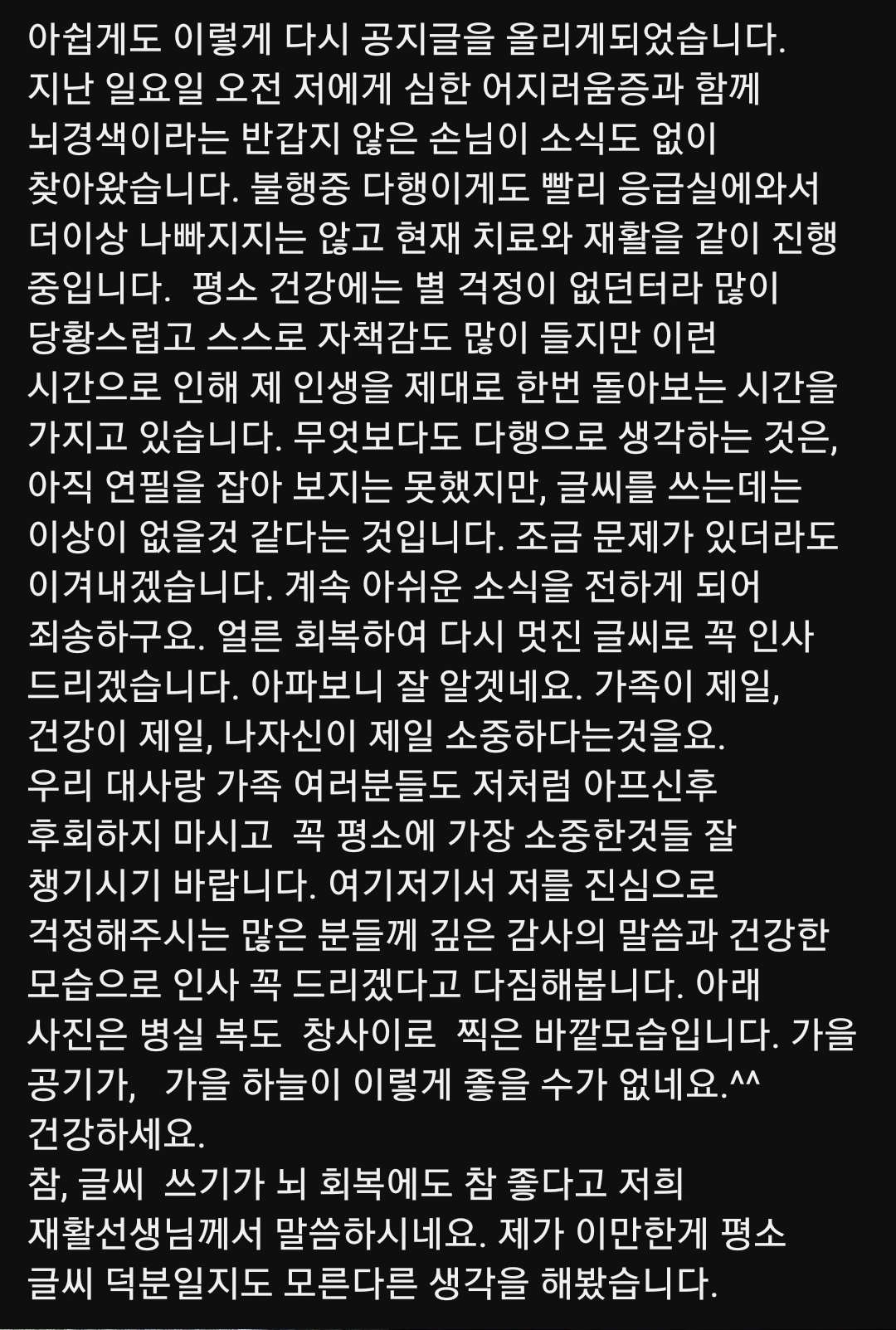 병상에서 깨어나자마자 가장 먼저 오른손 손가락을 하나씩 움직여보았다. 연필 잡는 자세도 취하고 엄지, 검지, 중지에 힘을 줬다 뺐다를 반복했다. 아마 본능적으로 '글씨 유튜버'임을 직감하고 테스트한 듯하다. 진심이었나 보다.