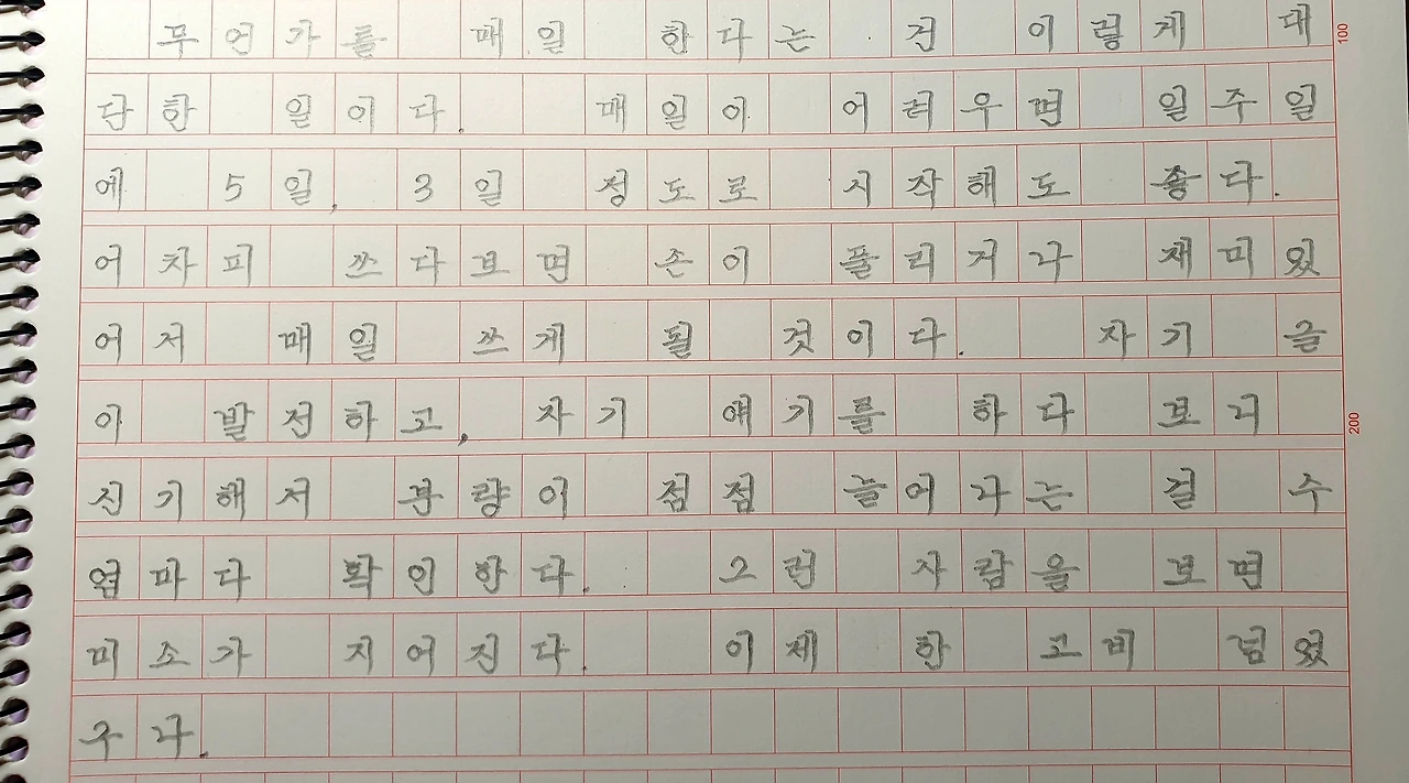 오늘 책 내용에서 작가는 글도 매일 쓰면 재미가 붙고 지속하는 힘이 생긴다고 했다. 글은 점점 좋아지고 분량도 늘어난다 했다. 필사도 똑같다. 매일 필사를 하면 생활이 된다. 독서와 글쓰기 연습이 된다. 문장력도 발전하고 글쓰기의 욕구가 생긴다. 또 다른 도전을 한다. 그렇게 삶은 넓어진다.