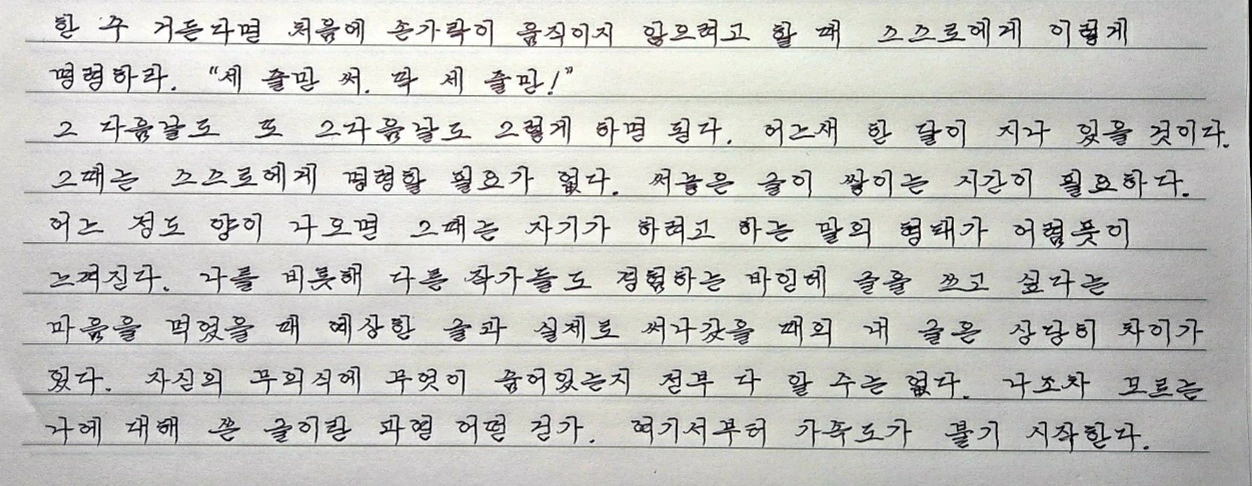오늘 글에서는 글쓰기 초반의 요령을 알려주었다. A4 용지를 꽉 채우는 양으로 시작을 권하지 않는다. 딱 세 줄이면 충분하다고 한다. 한 달을 세 줄 쓰기로 버틴다면 그다음은 글의 양이 자연스럽게 늘어난다는 것이다.