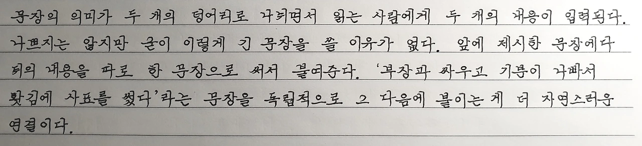 오늘 글에서는 두 개의 의미가 어어진 한 문장보다는 독립된 문장을 강조했다. 간결한 문장이 의미를 더 잘 전달한다는 의미다. 문장이 늘어져 주어와 동사가 잘 드러나지 않는다면 읽기 좋은 글이 아니다. 반대로 문장 속에 주어와 술어가 명확하면 독자는 의미를 정확히 알아챈다.