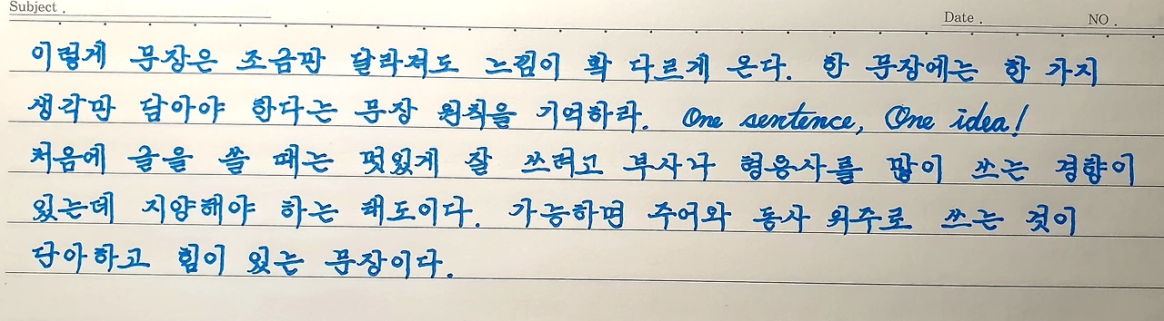이렇게 문장은 조금만 달라져도 느낌이 확 다르게 온다. 한 문장에는 한 가지 생각만 담아야 한다는 문장 원칙을 기억하라. One sentence, One idea! 처음에 글을 쓸 때는 멋있게 잘 쓰려고 부사나 형용사를 많이 쓰는 경향이 있는데 피해야 하는 태도이다. 가능하면 주어와 동사 위주로 쓰는 것이 단아하고 힘이 있는 문장이다.