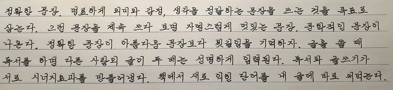 오늘 필사 글에서 작가는 정확한 문장을 아름다운 문장 앞에 두었다. 화려한 문장보다는 간결한 문장이 선행되어야 함을 강조했다. 명료한 문장을 계속 써야만 자연스러운 문장을 구사할 수 있다고 강조했다.