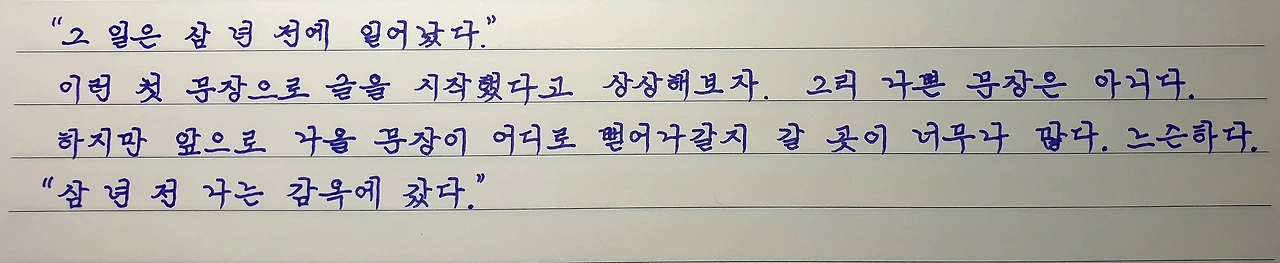필사는 책을 따라 쓴다. 교정을 거친, 맞춤법이나 띄어쓰기의 오류가 없는 청정 문장들을 따라간다. 유사한 단어와 문장 구조를 반복한다. 작가의 문체에 익숙해지고 신박한 어휘에 매료된다. 반복 쓰기로 띄어쓰기는 머리보다 손에 익숙해진다. 호흡도 끊어 읽으며 몸에 익숙해진다. 그렇게 띄어쓰기는 서서히 윤곽을 드러 낸다. 하지만 결코 손에 잡히어 내 것이 되지 않는다. 8대 불가사의다.