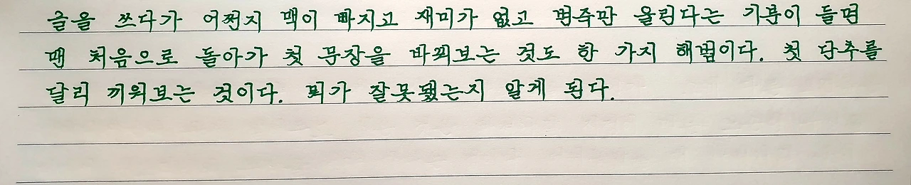 정해진 분량을 염두에 두고 글씨에 집중하면 글씨가 나아진다. 머릿속에 있는 닮고 싶은 글씨를 펜으로 직접 써보는 실습 시간이다. 글씨는 갈고닦아야 하는 수련과 같아서 조금씩이라도 매일 써야 좋다. 매일 필사가 이와 딱 맞아떨어진다. 또한 필사는 '다 쓴 노트'를 남기는데 시작과 나중의 글씨를 비교해 볼 수 있는 좋은 자료가 된다. 점점 좋아지는 글씨를 눈으로 확인하는 일은 또 다른 즐거움이다.