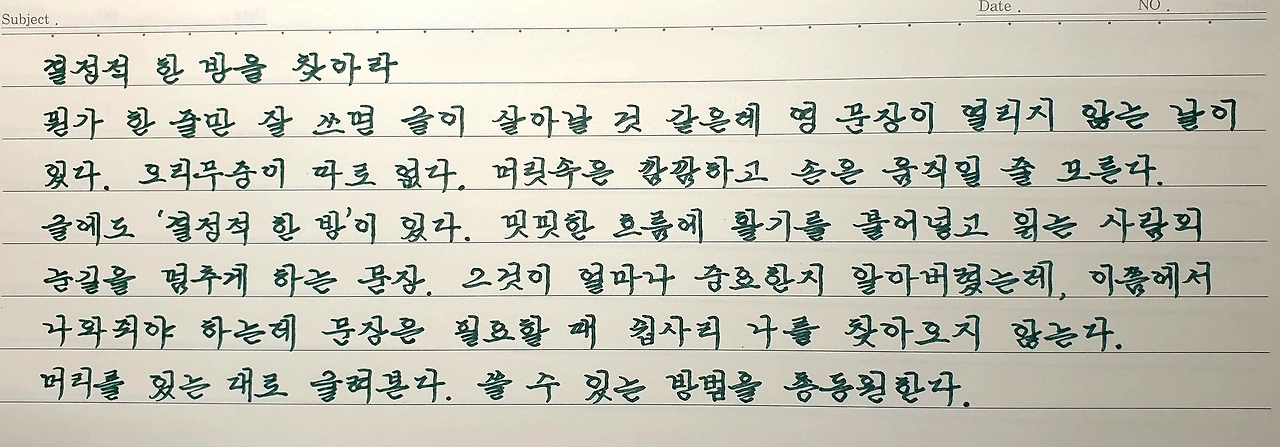 월요일~일요일 매일 밤 10시경에 좋은 책을 선정하여 필사를 하고 있습니다. 재미 없고 지루한 과정일 수 있지만 많은 분들이 저와 함께 필사를 즐기며 하루 15분을 오롯이 자신을 위해 보내고 있