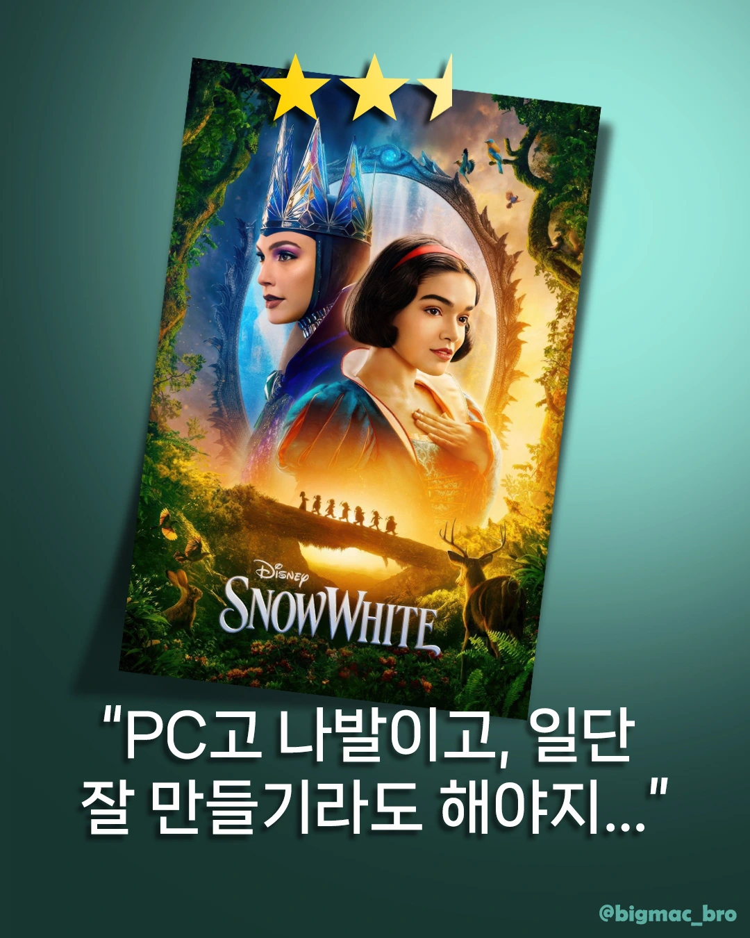 우선 '아름다움'에 대한 설정을 미모가 아닌 내면의 아름다움으로 바꿨다면 극중에서 백설공주가 그정도의 어필을 할만한 극적인 행동을 했어야 납득이 되는데... 그런부분이 전혀 없음. (죽어가는 난쟁이를 위해 희생을 한다던지, 여왕을 엄마로 잘 모신다던지... ???)