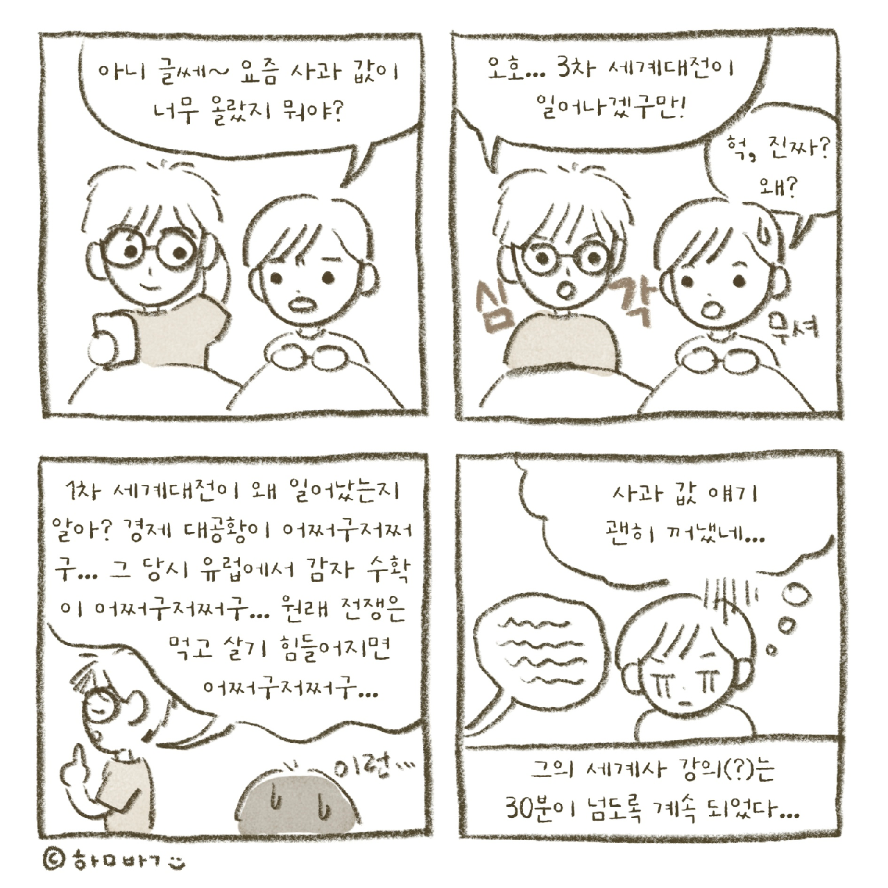 라고 한 마디 했을 뿐인데, 1차 세계대전이 왜 일어났는지, 물가가 오르고 경제가 안 좋아지면 일어나는 일에 대한 이야기를 한참 들어야 했다. 나는 이미 사과값 이야기를 꺼낸 것을 후회하고 있었다. 가끔은 자려고 누워 불을 껐는데 강의 모드로 전환돼서, 졸면서 그의 이야기를 들은 적도 많다.
