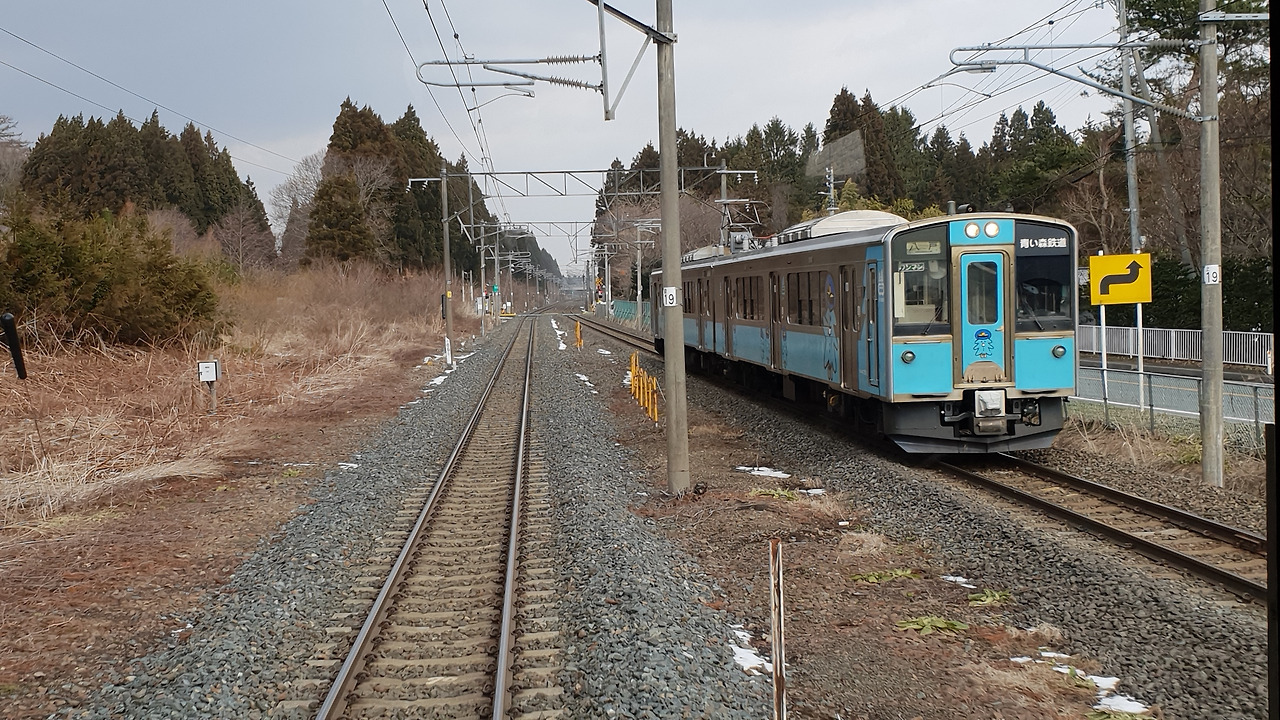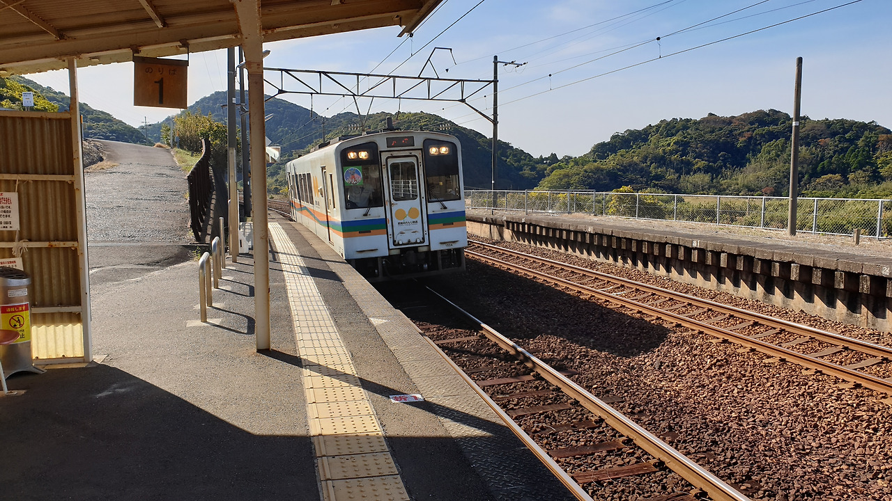상당히 긴 승강장으로 인해 그 어떤 열차보다도 왜소하게 보이는 제3 섹터 철도의 열차. 1량 편성으로 운행하는 열차는 전동열차로 운행할 수도 없어서 이처럼 잘 만들어놓은 전기 시설을 활용하지 못하는 경우가 다반사다. 대신 이 전기 설비는 이 구간을 운행하는 화물열차가 대신 잘 사용 중이다.